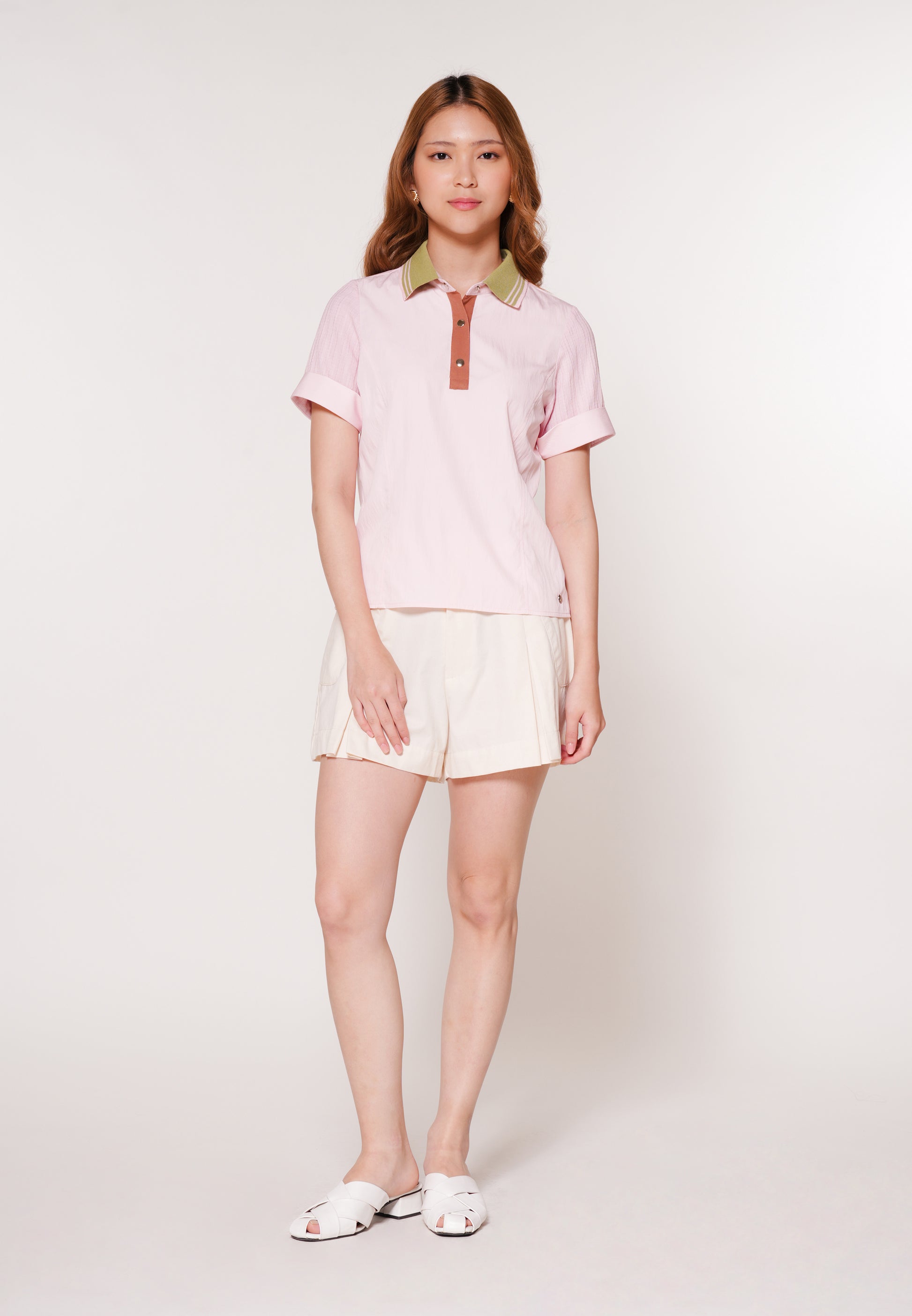 Short-sleeve top made from knit, designed in a regular fit for comfortable everyday wear. Featuring a collared neckline, short sleeves, half-placket button-down opening, and a front slit detail, it is finished at normal length for a clean and versatile look.