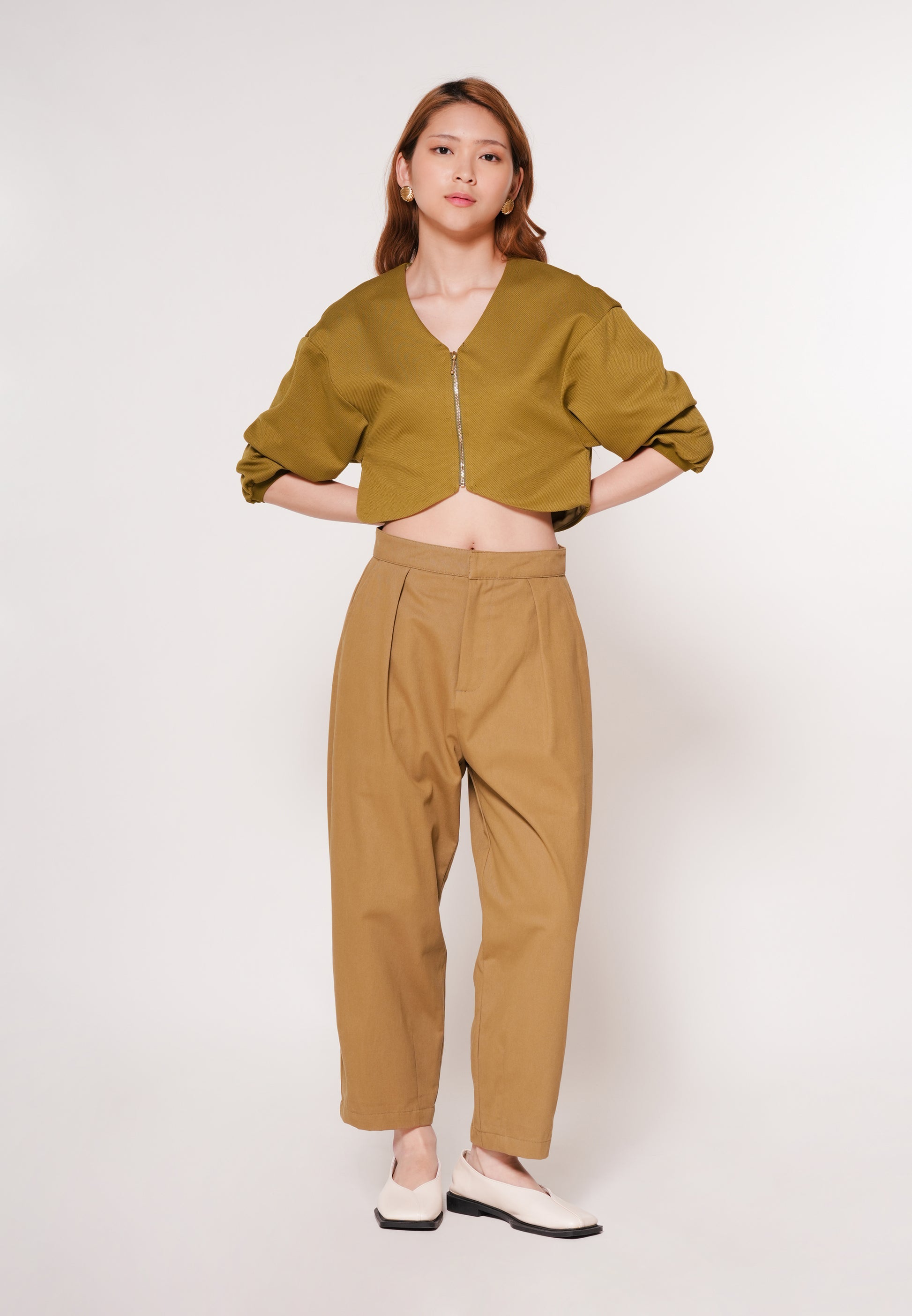 Pants made from cotton twill, designed in a carrot silhouette with a high waist for a flattering fit. Featuring a front zip opening, pleat details, and functional side pockets, they are finished at ankle length for a modern and versatile look.