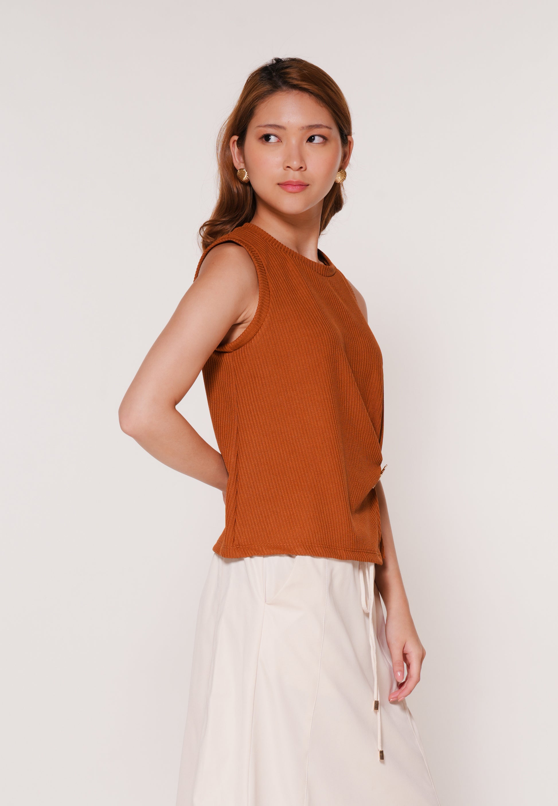 Sleeveless top made from ribbed knit, featuring a round neckline and drape detail. Designed with a sun applique and finished at a normal length for a casual, stylish look.