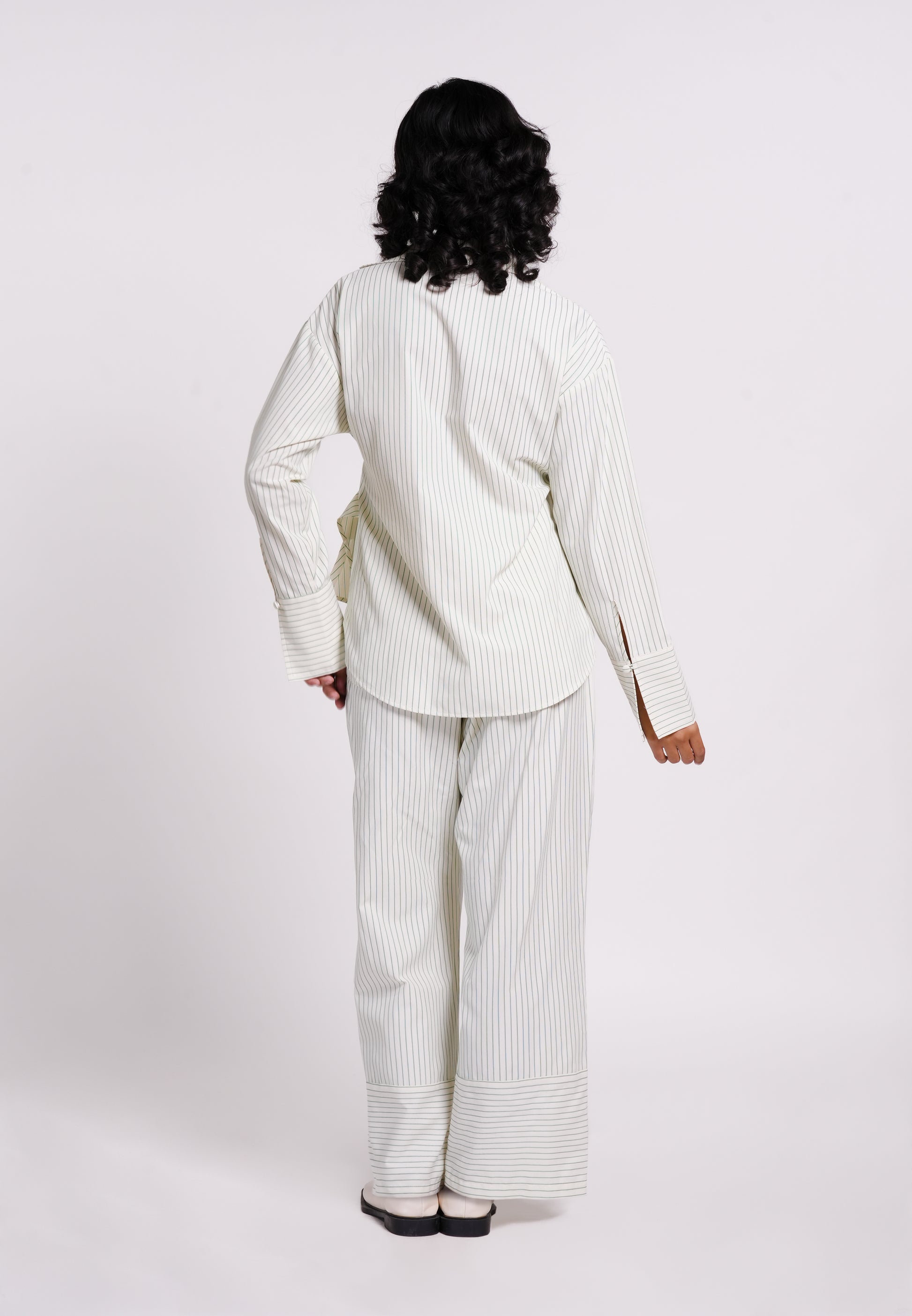 Elevate your everyday style with this Plains and Prints Top, designed for relaxed comfort and modern appeal. Made from a poly-cotton blend pinstripes, it features a collared V-neckline and front wrap opening with self-tie drawstrings for a flattering, adjustable fit. Long sleeves with buttoned cuffs add a polished touch, while the relaxed fit and regular length make it perfect for casual days or smart-casual styling.