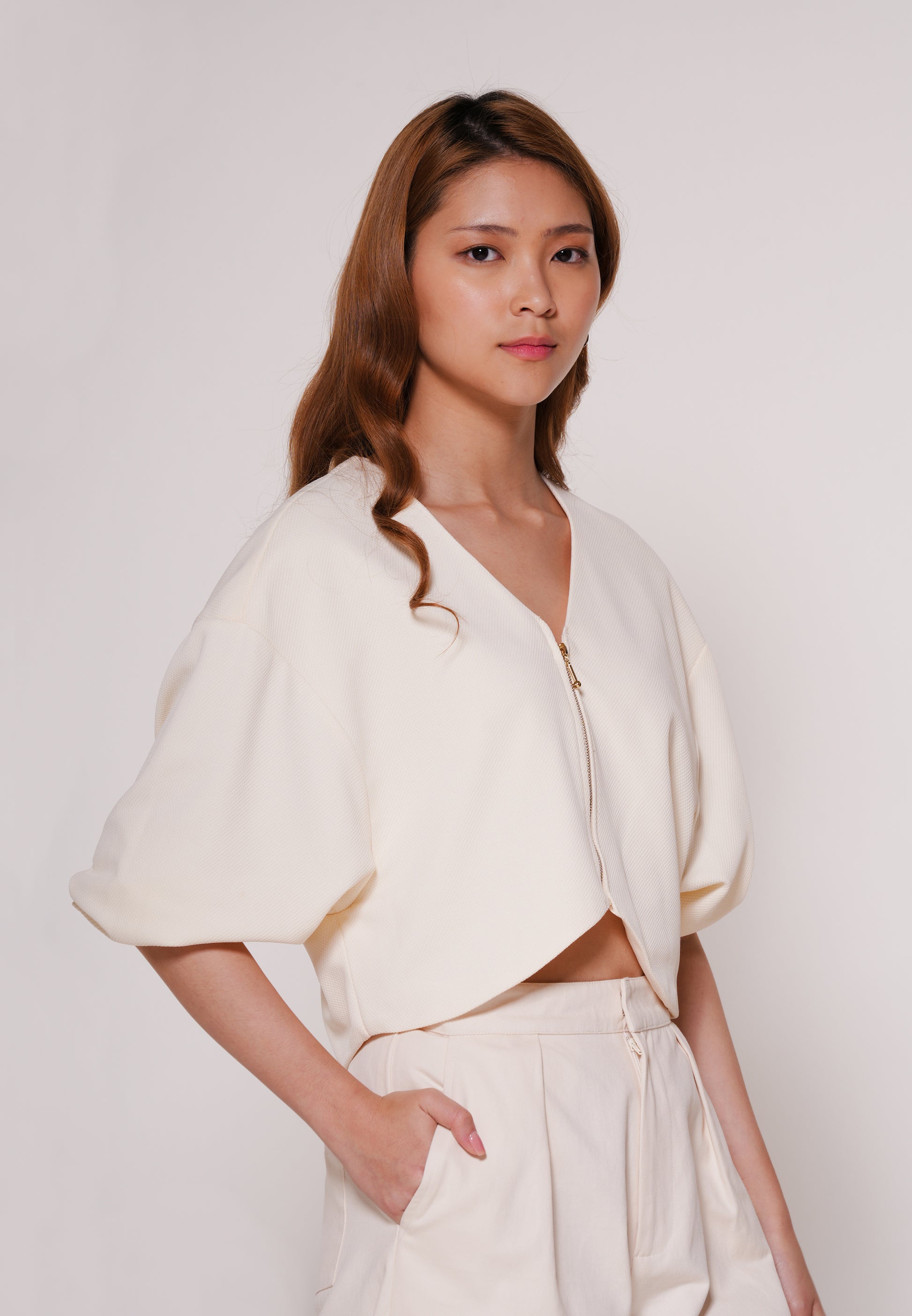 Quarter-sleeve top made from lightweight polyester, designed in a relaxed silhouette for easy wear. Featuring a front zip opening, puff sleeves, and a flattering V-neckline, this top is finished with an uneven cut hem at a decent cropped length for a trendy, modern look.