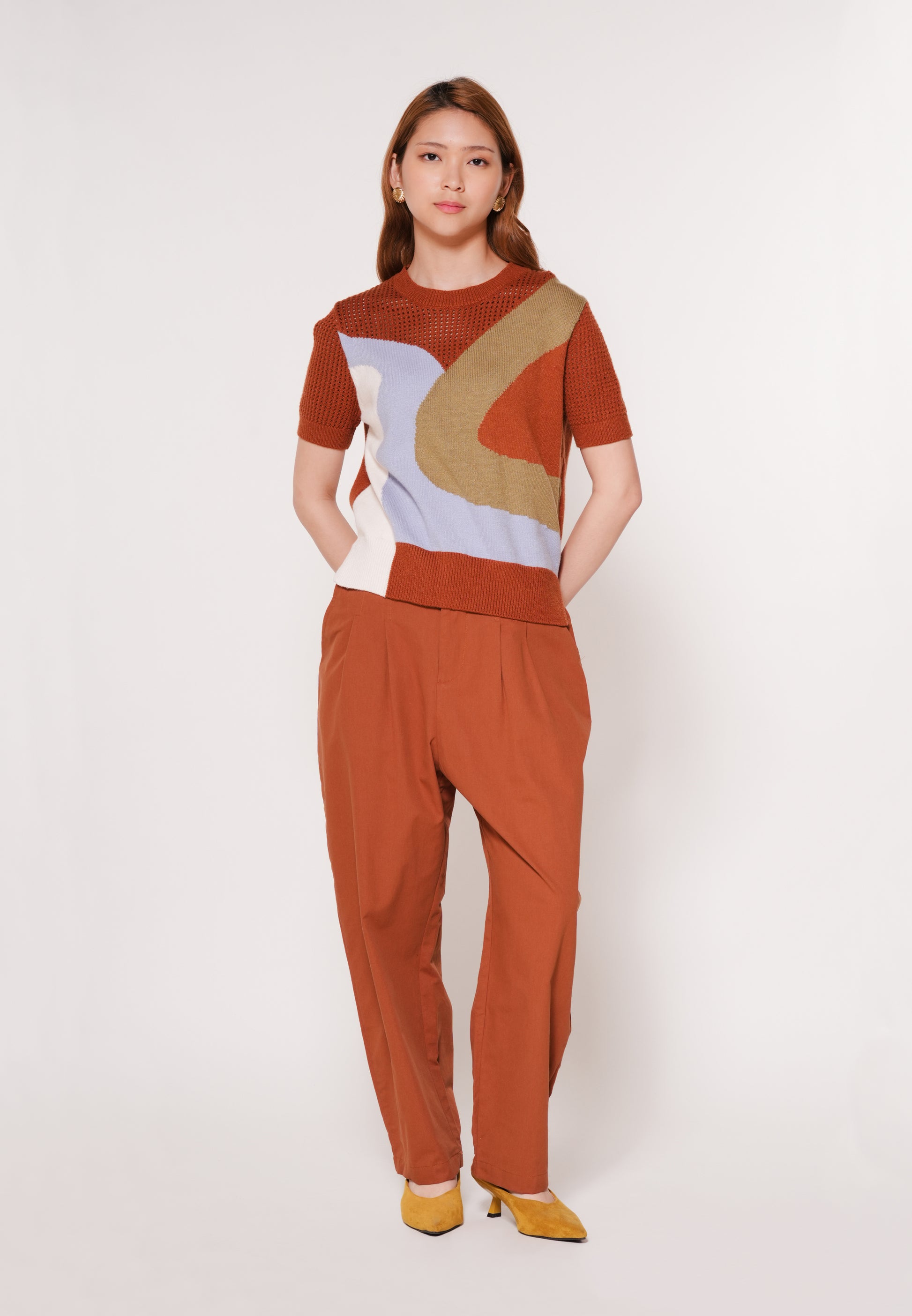 Short sleeve top made from flat-knit fabric, featuring a round neckline and standout intarsia print. Designed with a hem band and a regular-length finish for a clean, easy-to-wear look.
