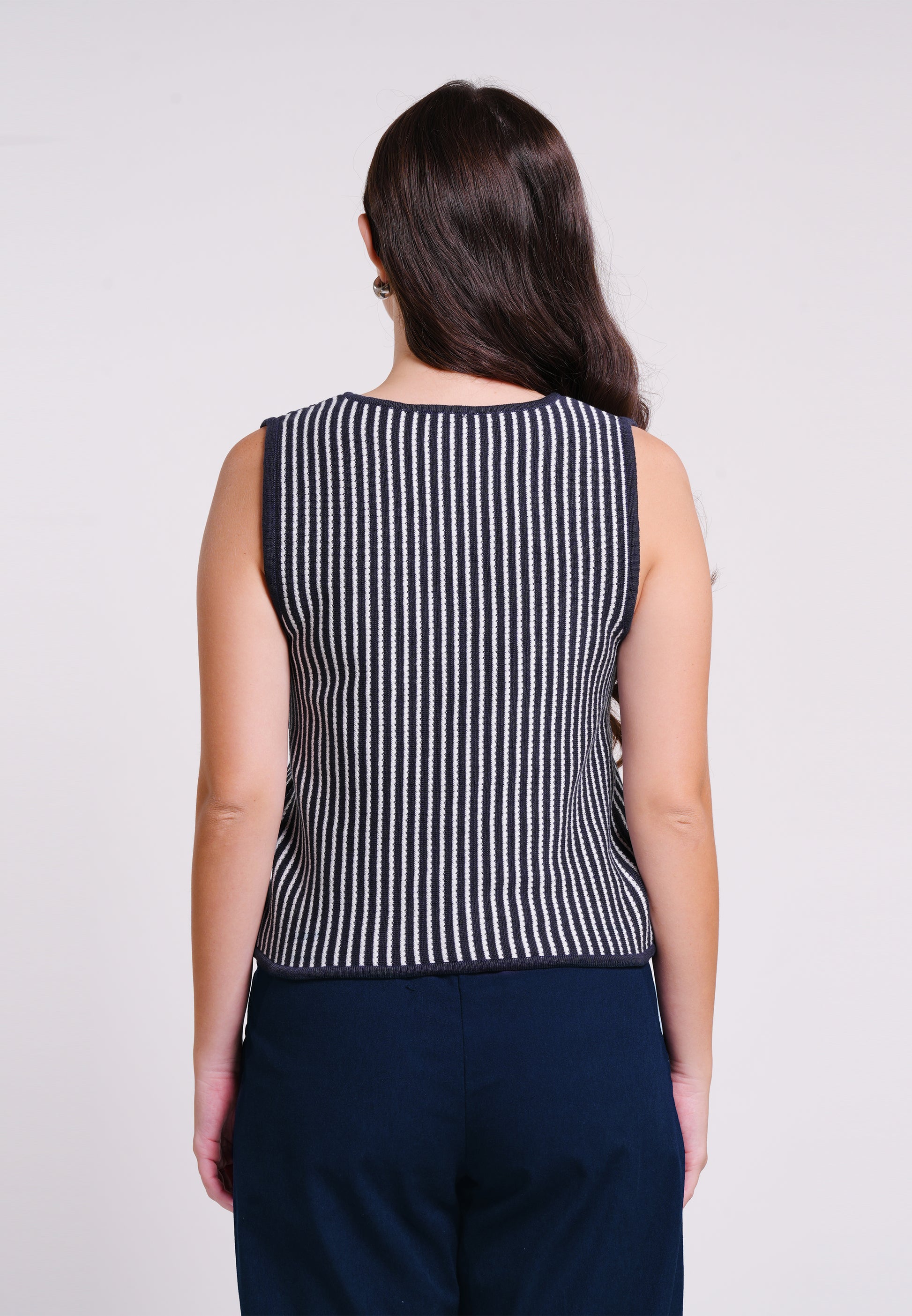 Sleeveless top made from flat knit, designed in a relaxed fit for comfortable everyday wear. Featuring a V-neckline, front button-down opening, and contrast piping detail, it is finished at normal length for a versatile and stylish look.