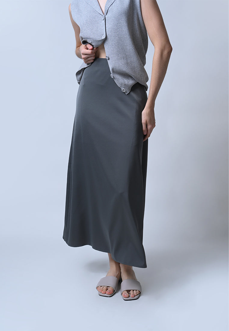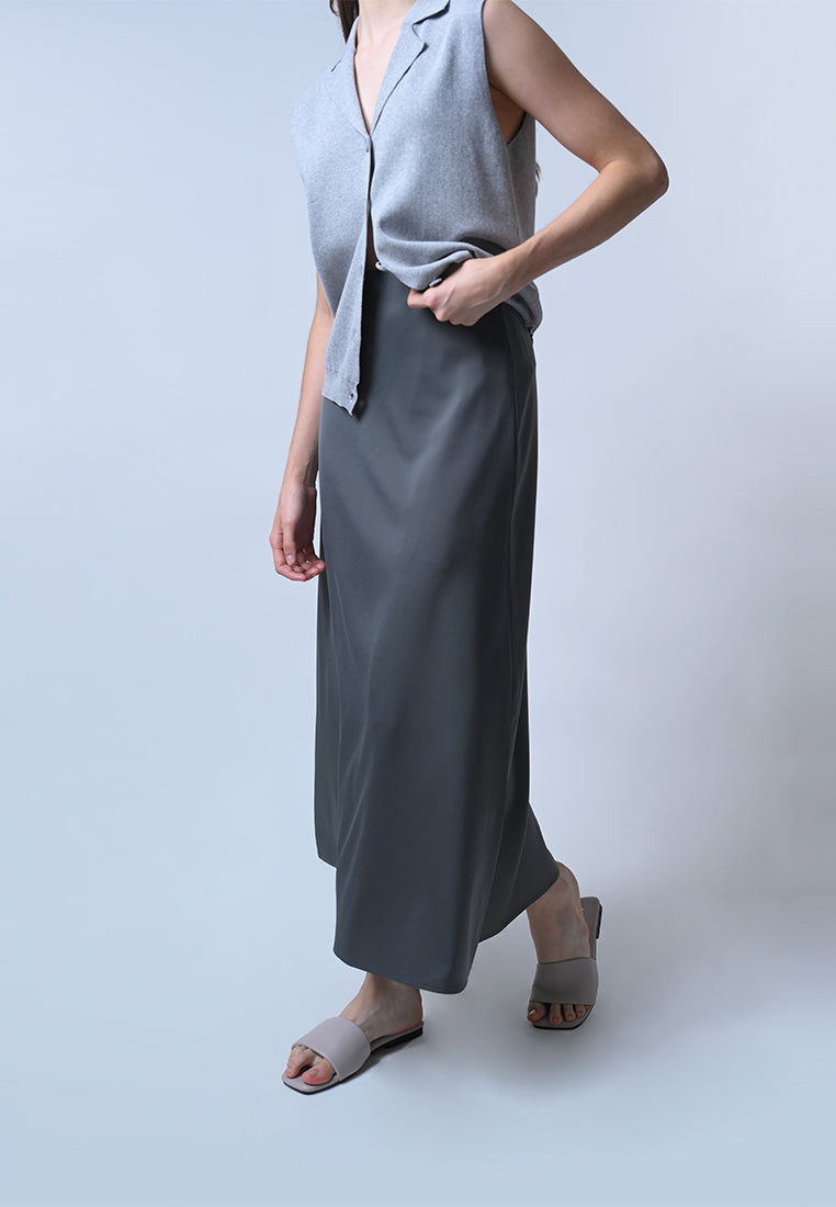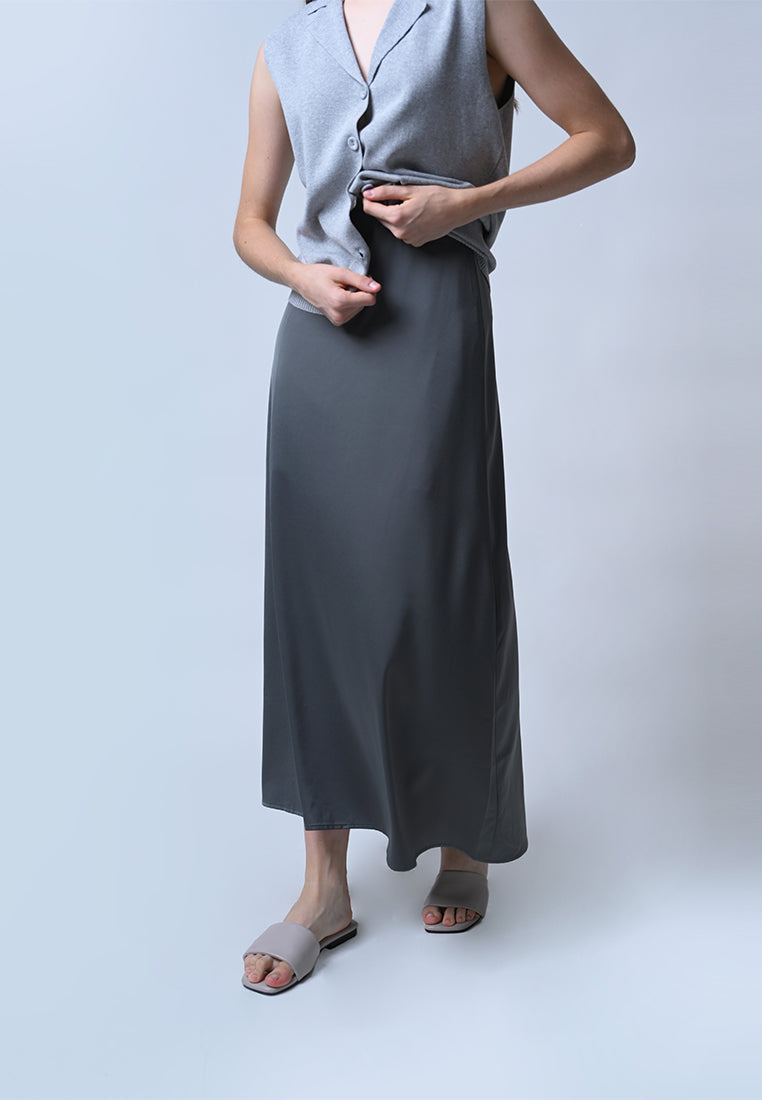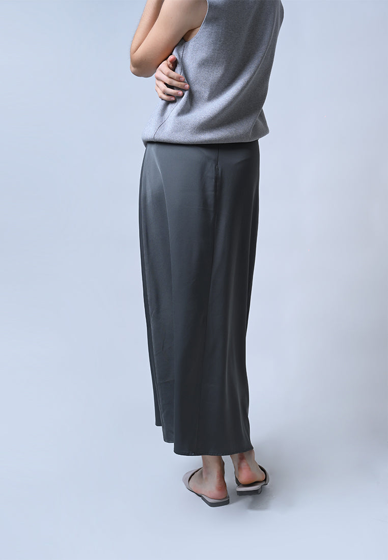 Streamlined chic is here. The Fella skirt in a gorgeous gray satin material features a beautiful A-line silhouette that falls just below the ankles.
