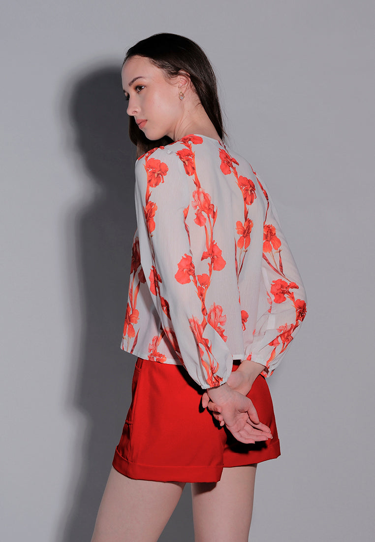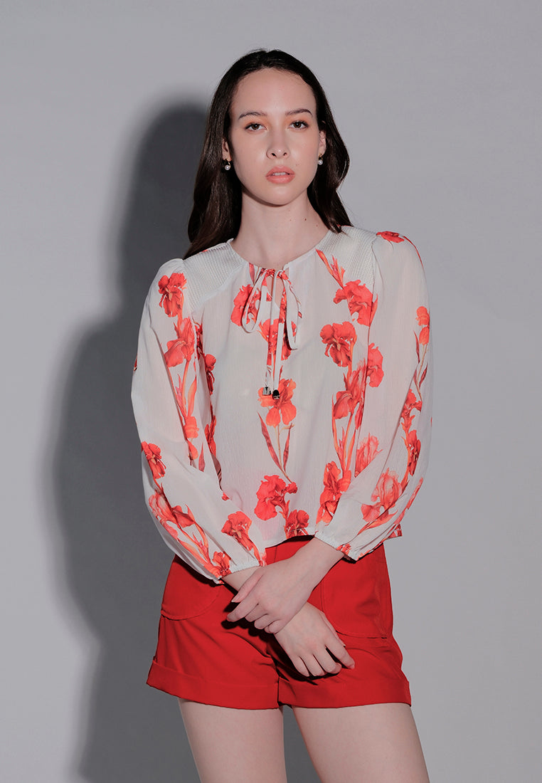 Long-sleeve top made from burnout dots polyester, featuring a V-neckline with a front self-tie drawstring opening for a delicate touch. Designed with a mesh shoulder yoke, full digital print, and puffed long sleeves with gartered openings, finished in a regular length for a stylish, contemporary look.