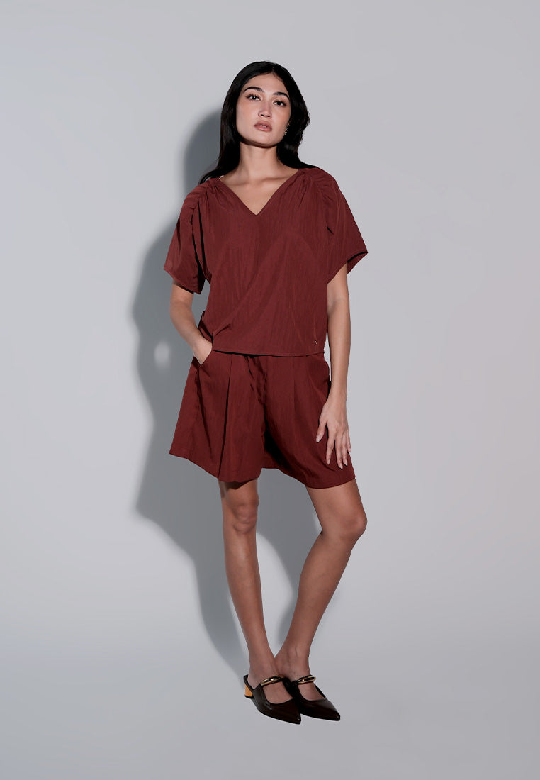 High-waisted shorts made from polyester, featuring side pockets and front and back pleat details for a structured yet refined look. Designed with a side zip opening and an above-the-knee length for a polished finish.