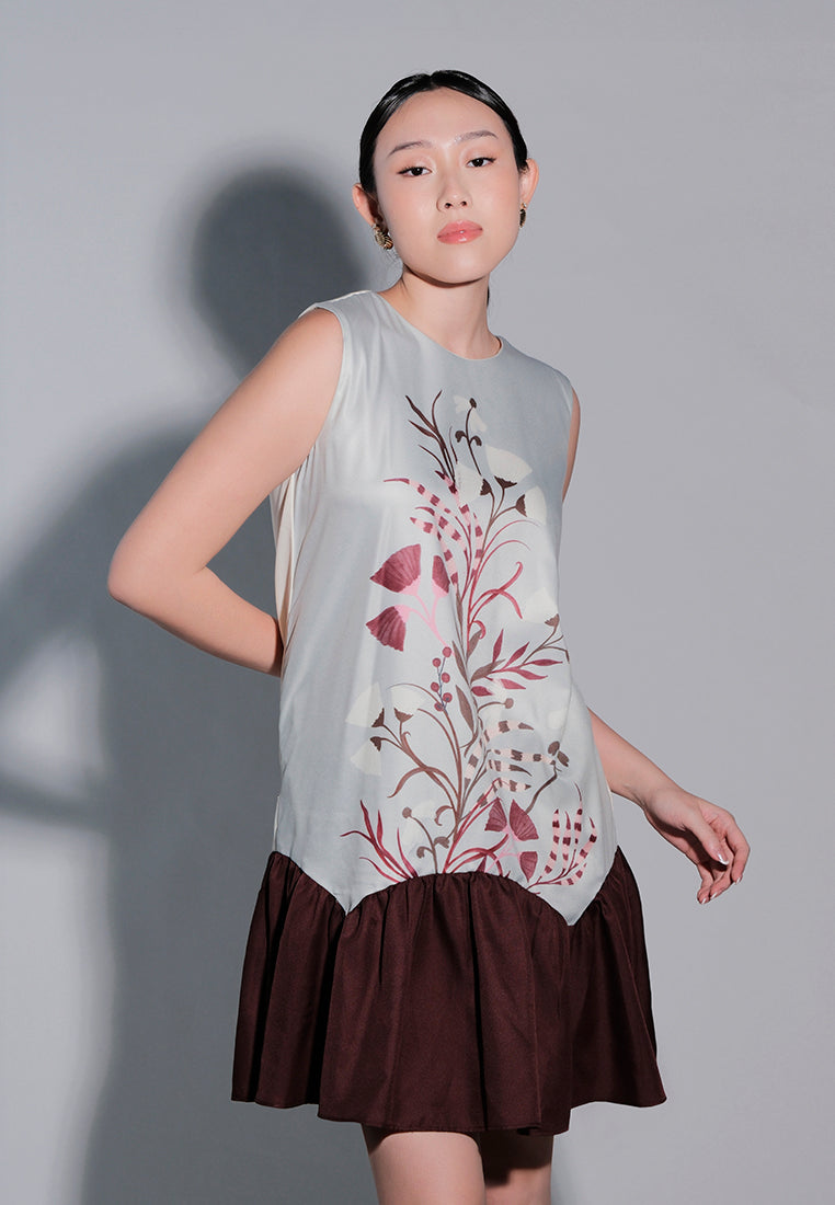 A relaxed-fit sleeveless dress made from polyester, featuring a round neckline and a drop-waist silhouette. Designed with a contrast shirred hem and a digital panel print for a standout look. Finished with side pockets, a back button-down opening, and an above-the-knee length for easy, everyday wear.