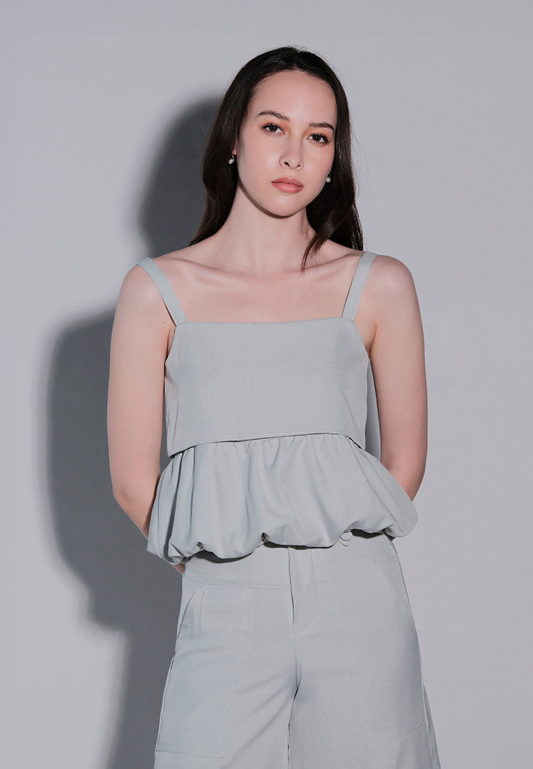 A sleeveless bubble top made from poly twill fabric, featuring a pinafore neckline with a layered chest detail. Finished with a bubble hem for a soft, voluminous silhouette at a regular length.