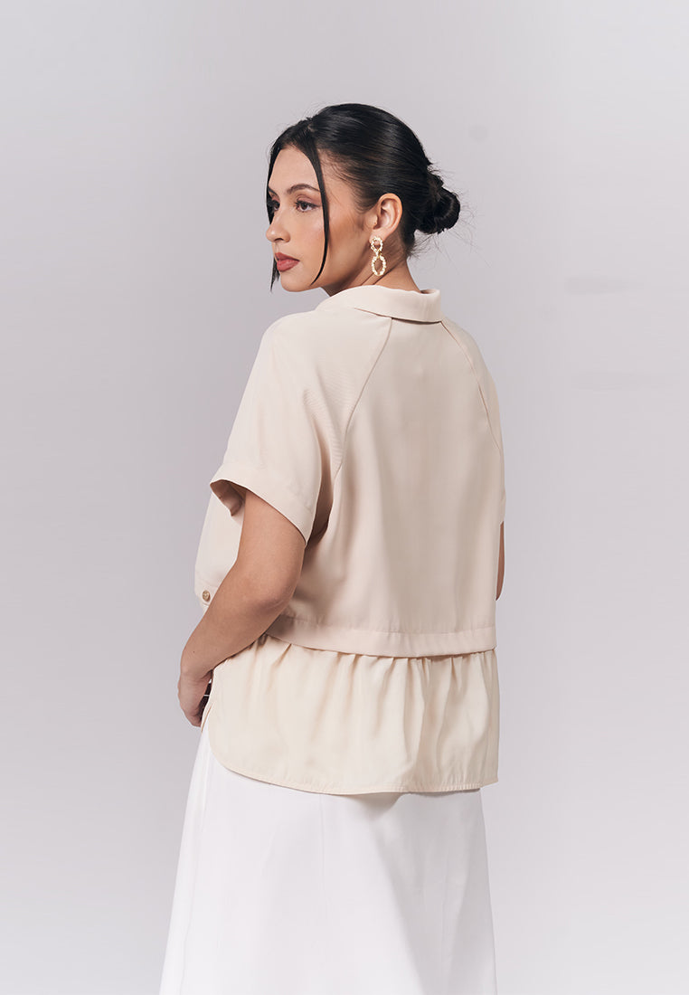 bell-sleeved top, features a billowy raglan sleeve, flat collar, with a front closure, and faux peplum details along the waist.