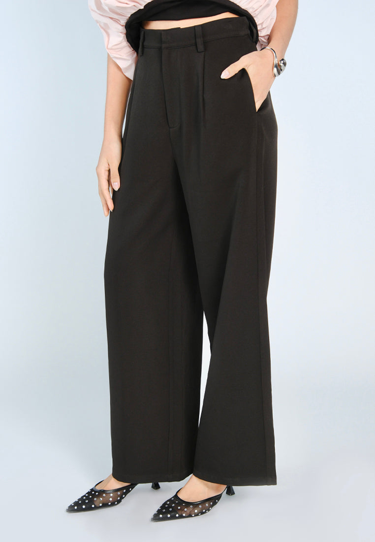 High-waist wide-leg pants made from polyester, designed with a zip fly and hook-and-bar closure for a sleek finish. Detailed with belt loops and functional side pockets, cut at a standard length for versatile, everyday styling.
