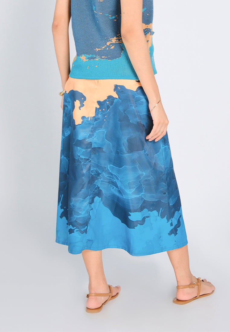 An A-line poly satin skirt designed with a high-waist silhouette, midi length, and a bold full digital print. Finished with a side zip opening for a sleek fit.