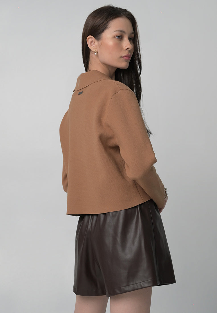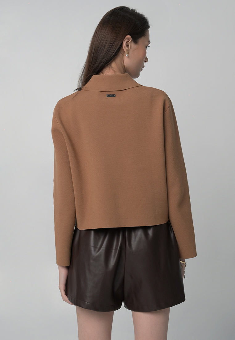 Cropped flat knit button-down top with flat collar and statement button detailing.