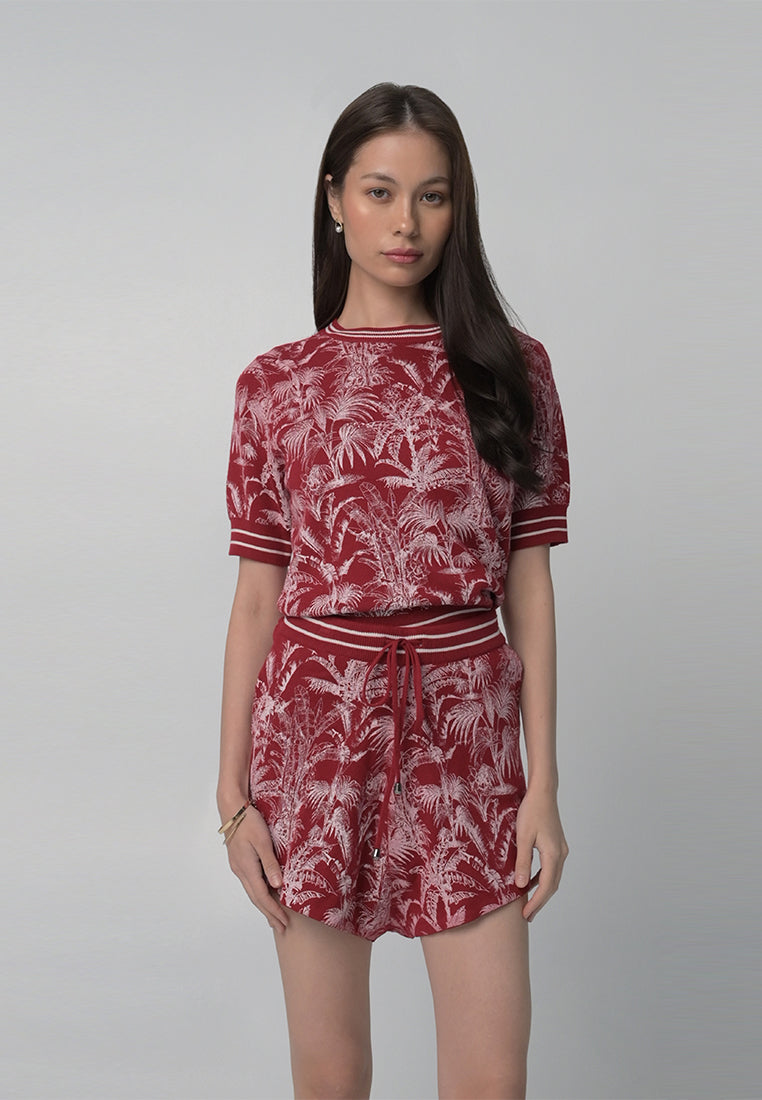 Casual shorts feature a tropical-inspired print in the toile de jouy tradition, accented with striped ribbing along the waistband, with a drawstring.