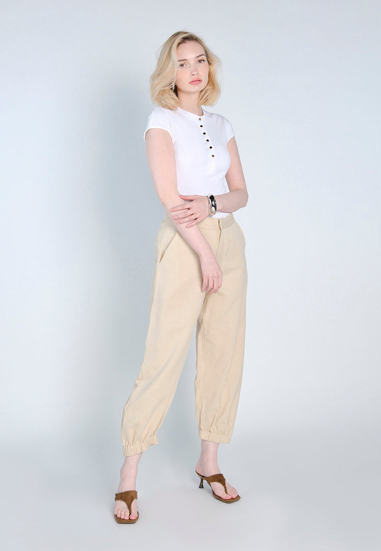 A versatile cotton rib bodysuit featuring a round neckline and a front placket with snap buttons. Designed with extended short sleeves and a secure snap closure at the crotch for all-day comfort and ease of wear.