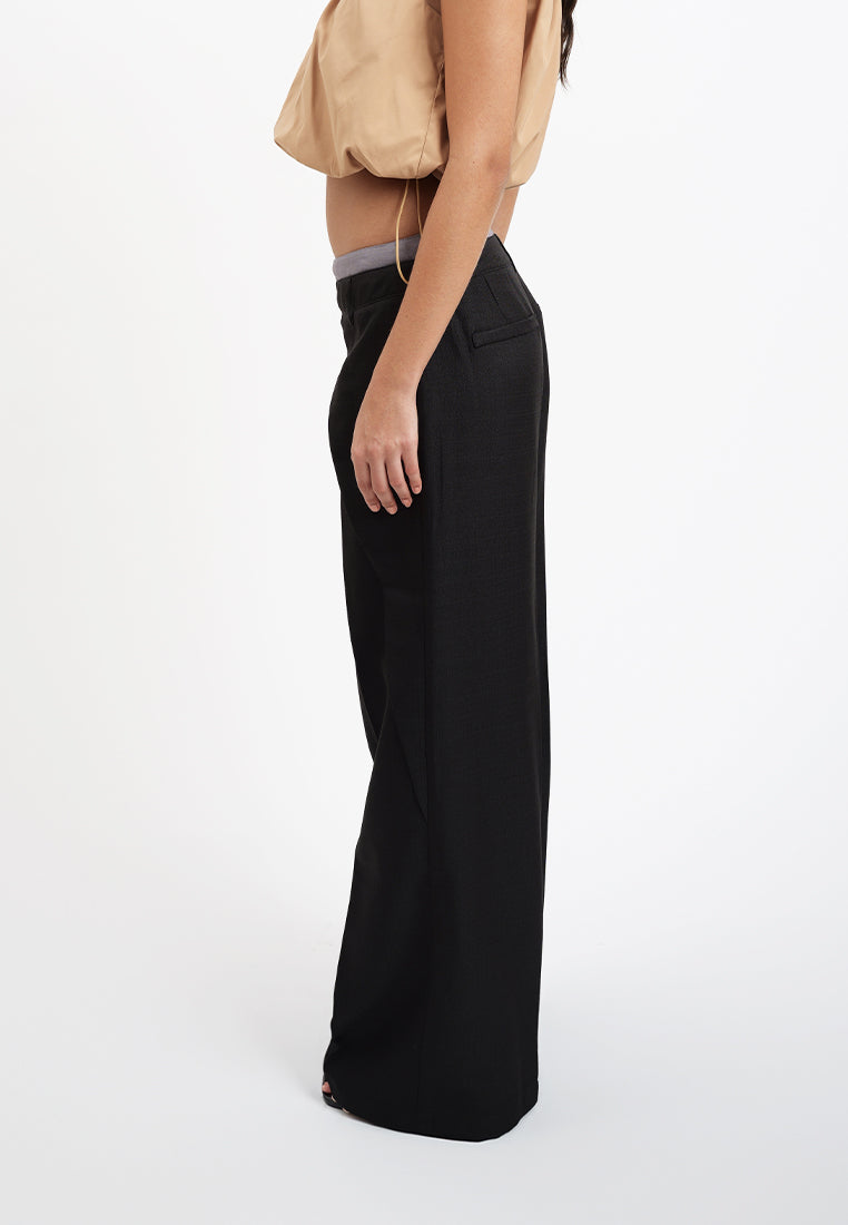 Wide-leg trousers in poly linen, designed with a double waistband and front pleat detail for a refined touch. Features a front zipper opening with belt loops, functional side slit pockets, and faux welt pockets at the back for a clean finish.