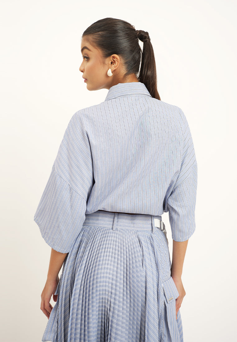 A short-sleeved top crafted from cotton poplin in a boxy silhouette, featuring drop-shoulder sleeves and a collared neckline. Designed with a front button closure, double chest pockets, and a drawstring hem detail for a relaxed yet structured finish.