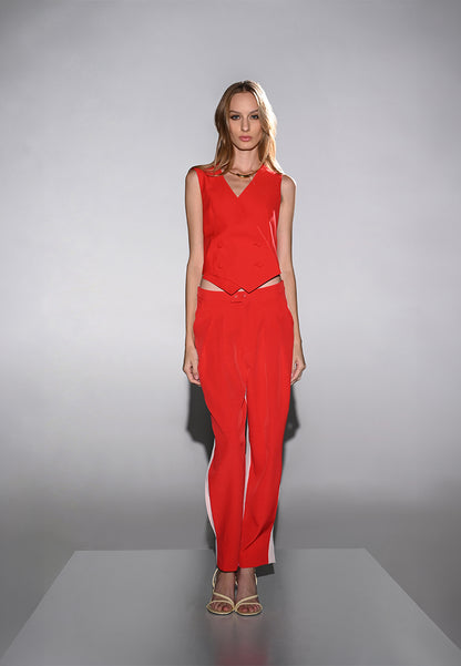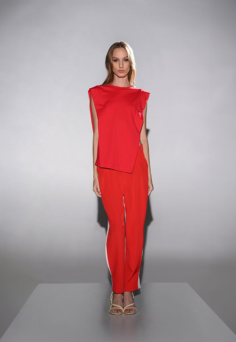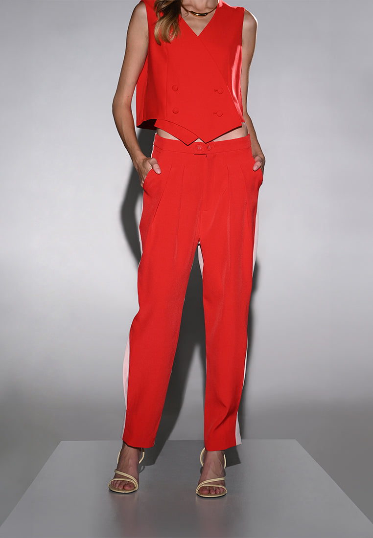A bold and stylish choice. The Hills Pants feature a color-blocked panel design with pleated detailing on one pant leg, creating a flattering silhouette that tapers down to the ankle.