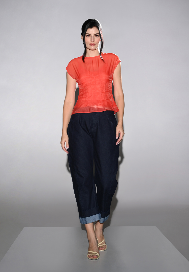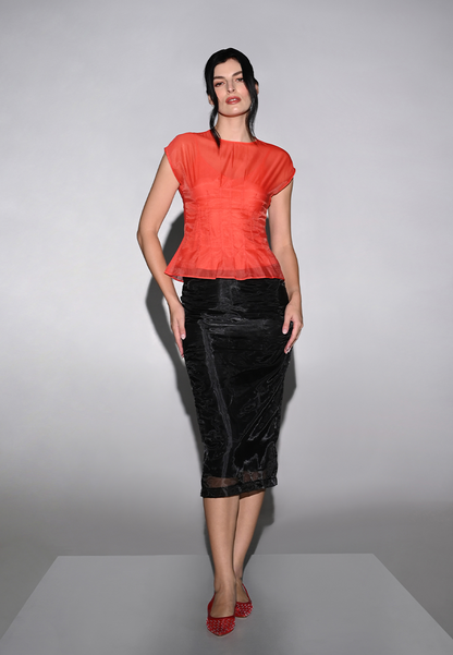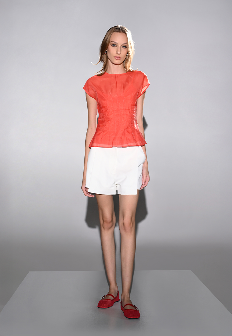 Elevate your wardrobe with the Hueva top. This stylish top features a poly lining with a mesh overlay, extended shoulders, and a flared hem for a modern and feminine look.