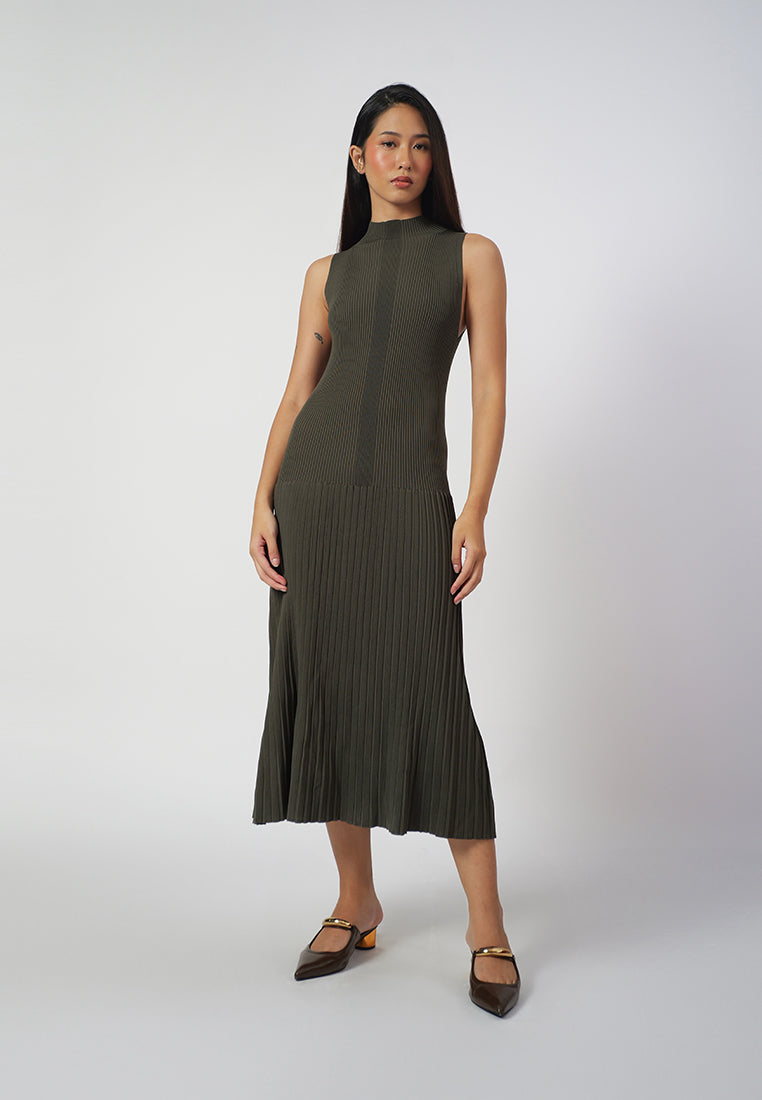 A regular-fit dress made in flat knit, featuring a high neckline and ribbed pleated texture. Designed with a flared skirt and finished in a midi length for an elegant, timeless look.