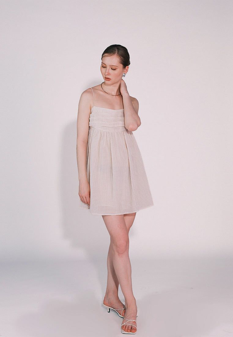 Babydoll dress with spaghetti straps feature pleated bodice and gathered voluminous skirt.
