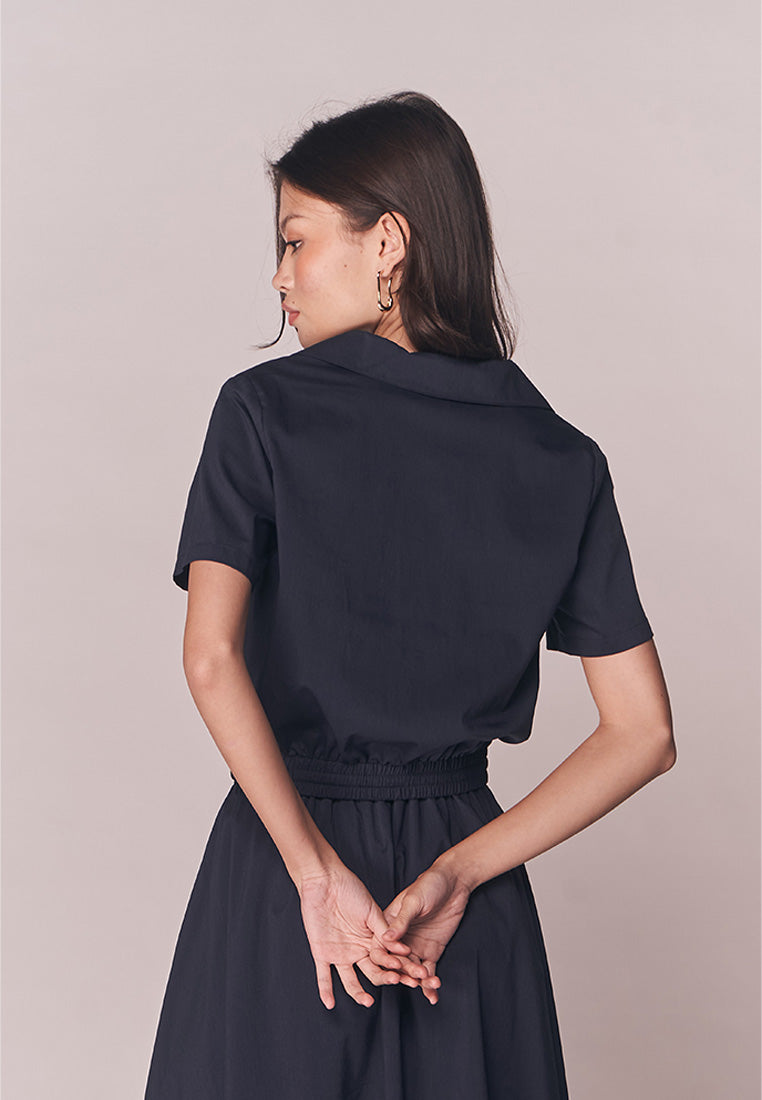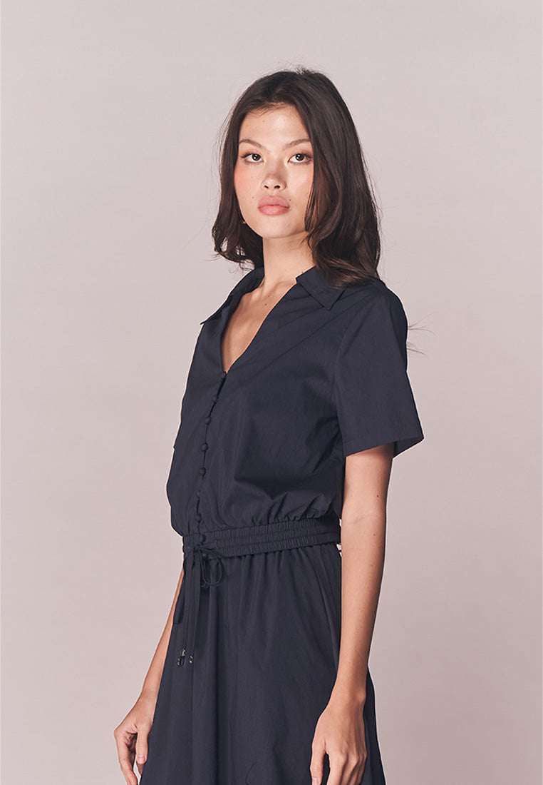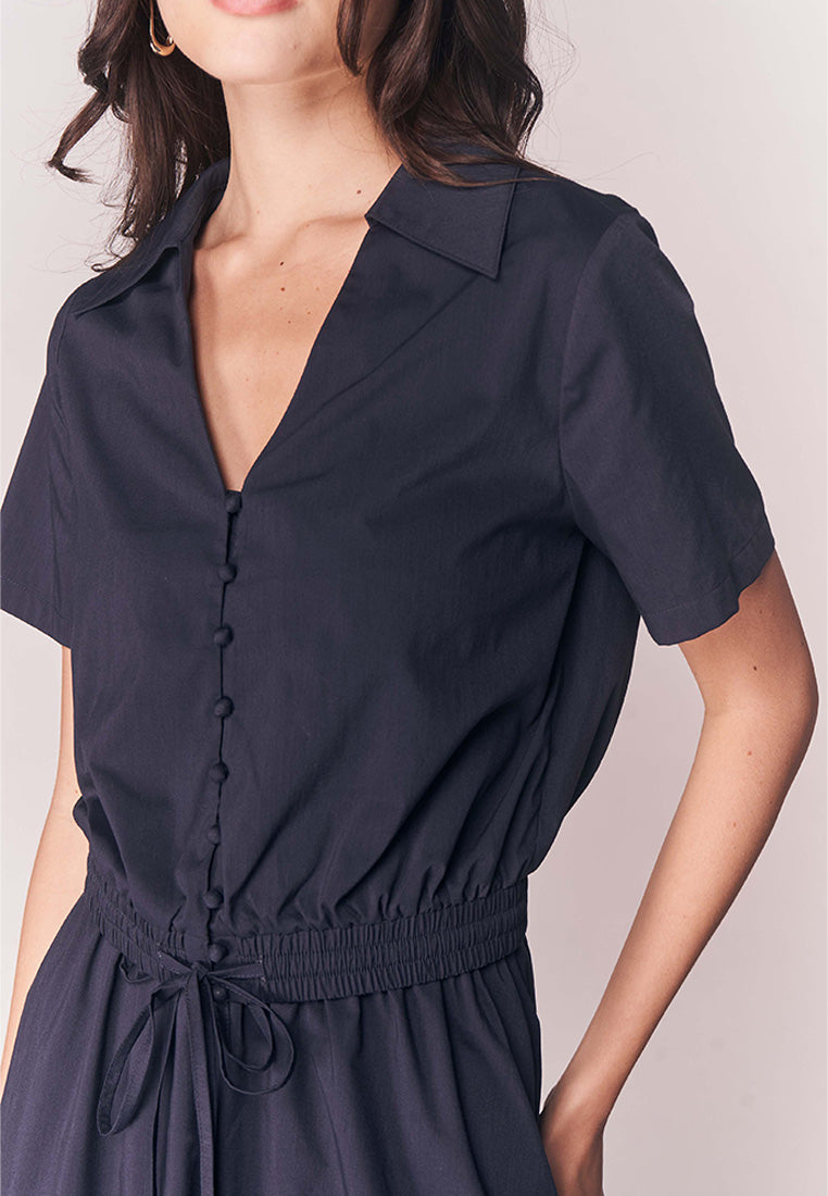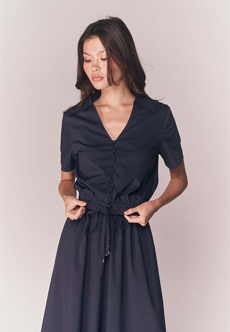 V-neckline button-down top with short sleeves and adjustable hem detail.